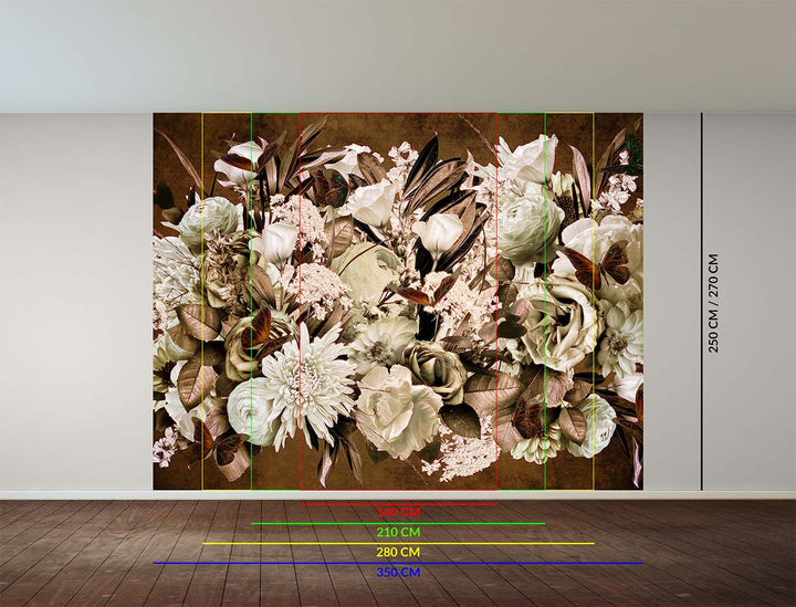 Dit behang brengt een weelderige botanische sfeer in huis, waar bloemen, bladgroen en vlinders op een donkere, sfeervolle achtergrond prachtig samenkomen. Perfect voor creatieve interieurs met een klassieke touch, en ideaal in kamers die verlangen naar een luxueuze, bloemrijke uitstraling. Geef je muur karakter met dit unieke wallpaper.