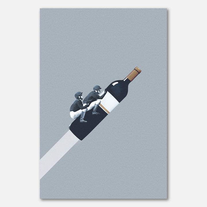 Dit schilderij brengt een speelse mix van jet-helmen, wijnflessen en vintage vibes samen, waardoor het perfect past bij een stoer interieur of een stijlvolle barhoek. De wanddecoratie straalt avontuur en gezelligheid uit en geeft elke ruimte een unieke, grafische twist.