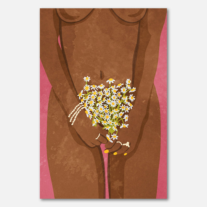 Deze wanddecoratie vangt de kracht en elegantie van vrouwelijkheid met sensuele lijnen, kleurrijke accenten en zachte witte bloemen. Perfect voor moderne interieurs die durf combineren met zachtheid, geeft dit schilderij elke ruimte een feminiene en artistieke touch die inspireert en intrigeert.