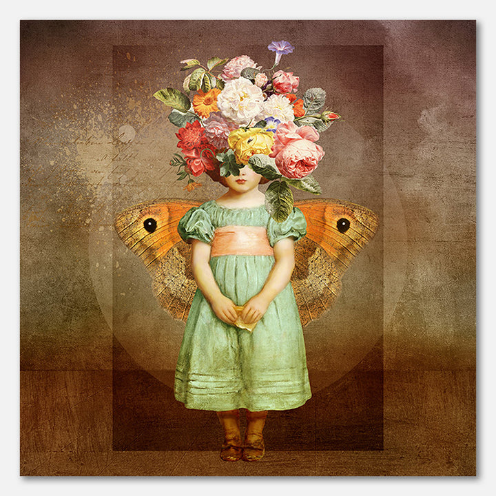 Lieflijk en dromerig portret van een meisje, een mensenkind met elfjes- bloed. Herinneringen aan vroeger, toen we nog wisten dat magie echt bestaat. Vintage kunst gemaakt met de moderne computertechniek anno 2021.