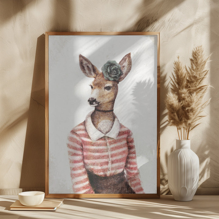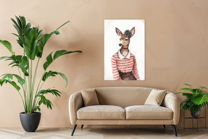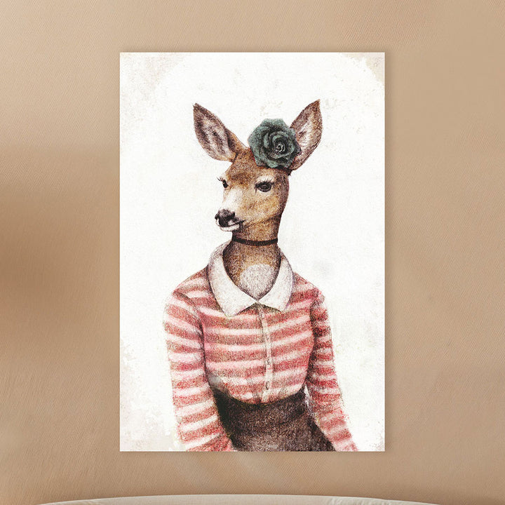 Dit schilderij combineert een hert met een menselijk lichaam, waardoor een unieke en speelse wanddecoratie ontstaat die perfect past bij een modern of vintage interieur. De frisse groene en roze accenten en het surrealistische karakter maken dit kunstwerk een echte blikvanger voor elke ruimte.