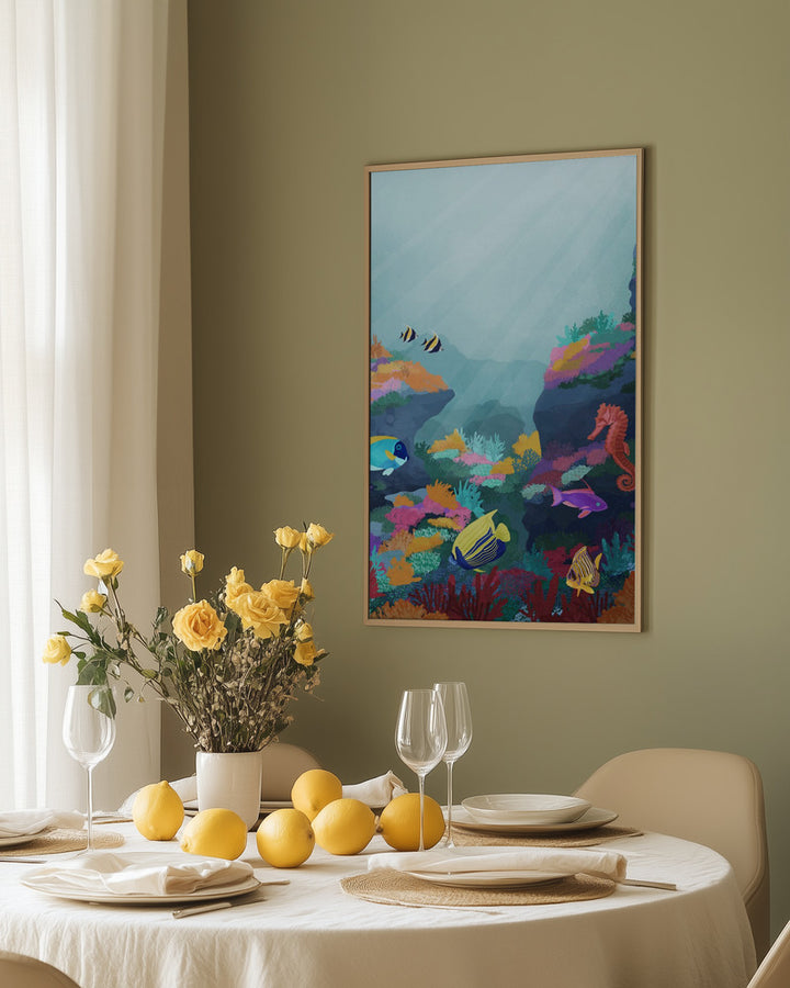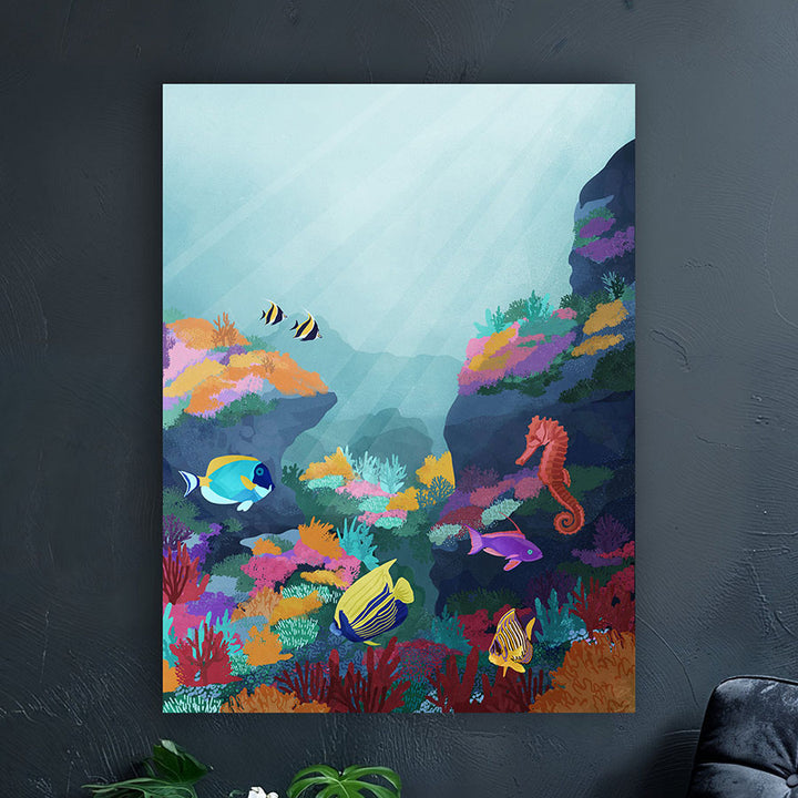 Deze kleurrijke wanddecoratie neemt je mee naar een onderwaterwereld vol scholen vissen en levendige koraalriffen. Het schilderij straalt avontuur en natuur uit, waardoor het perfect past in een speelse kinderkamer, een moderne woonkamer of elke ruimte die verlangt naar een frisse, oceaanachtige sfeer.