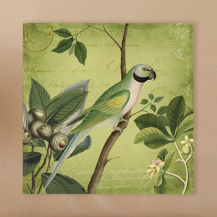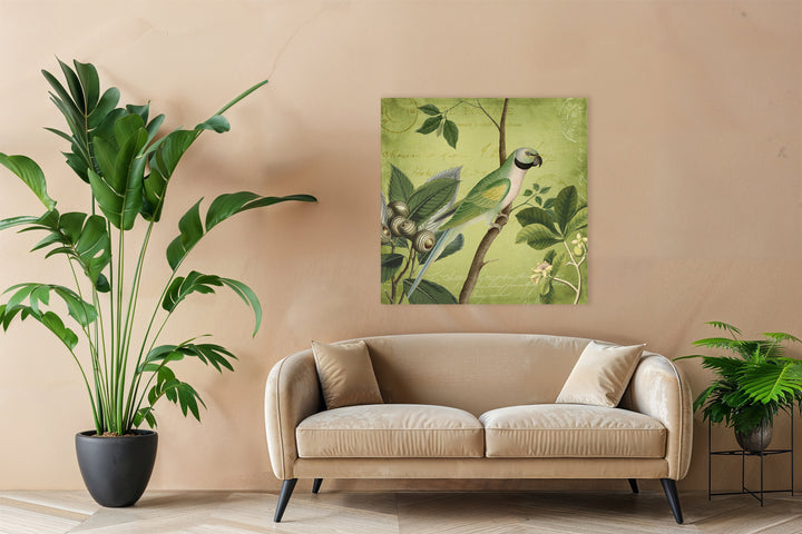 Laat je kamer tot leven komen met deze grafische wanddecoratie vol vogels tussen weelderige bladeren en botanische bloemen. Deze illustratie ademt rust en frisheid door de groene tinten, perfect voor liefhebbers van dieren, planten en een natuurlijke woonstijl. Ideaal in moderne, botanische en Scandinavische interieurs.