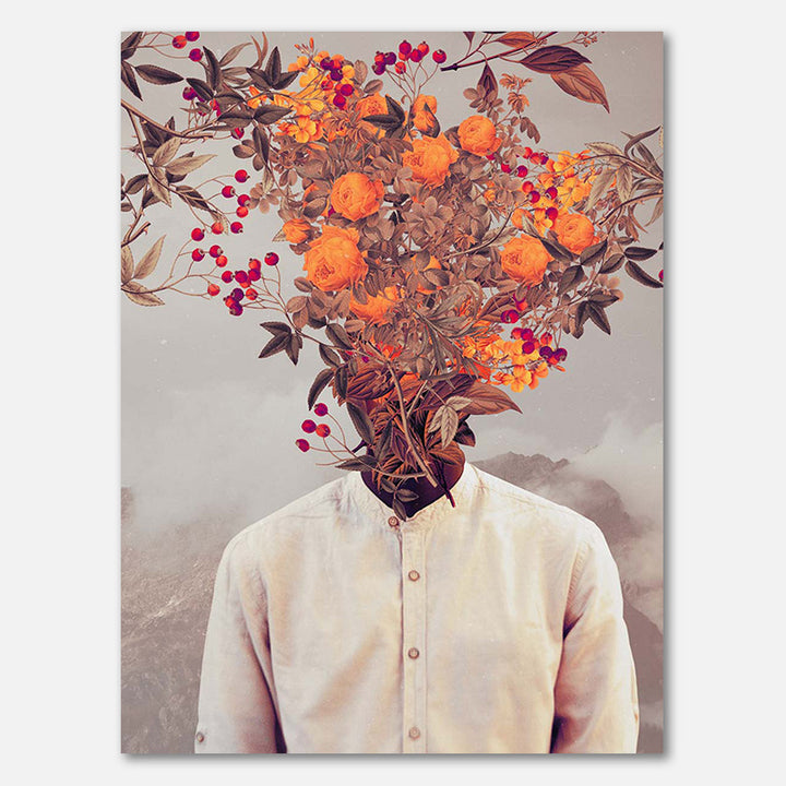 Deze prachtige wanddecoratie combineert op unieke wijze een creatief portret met een prachtige bloemenexplosie, waardoor een opvallende digitale collage ontstaat. De warme herfstkleuren en botanische elementen geven een gevoel van nostalgie en elegantie, terwijl het surrealistische karakter perfect past bij retro en moderne interieurs. Voeg met dit kunstwerk een vleugje luxe, creativiteit en gratie toe aan je woonkamer of kantoor.