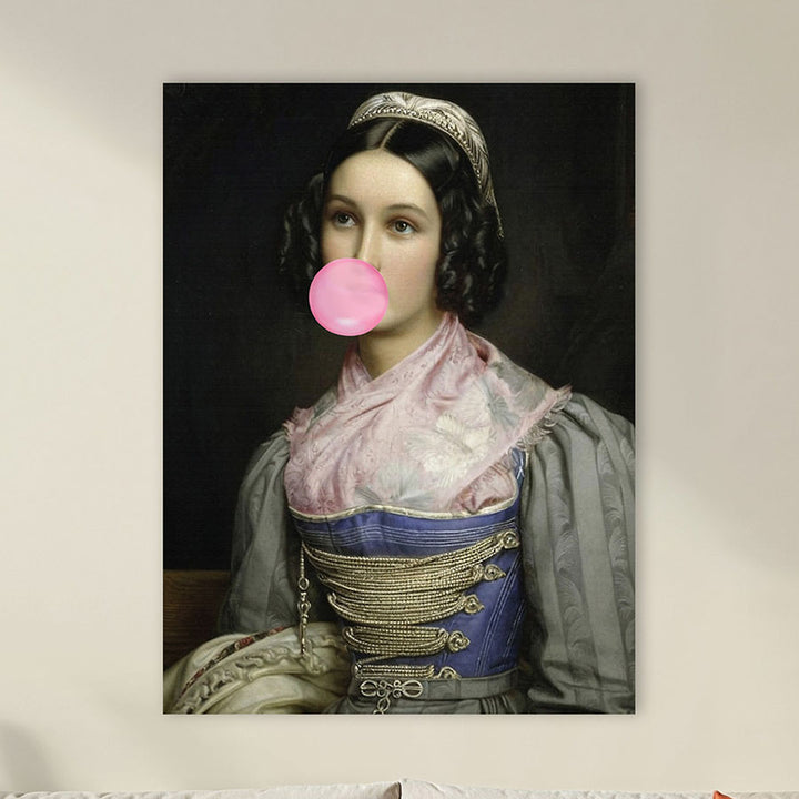 Dit schilderij brengt een speelse twist in je interieur door het portret met vrolijke bubblegum accenten, perfect voor een moderne of eclectische stijl. Deze wanddecoratie past moeiteloos in een kleurrijke woonkamer, kinderkamer of creatieve werkplek en laat elke ruimte opvallen met zijn unieke look.