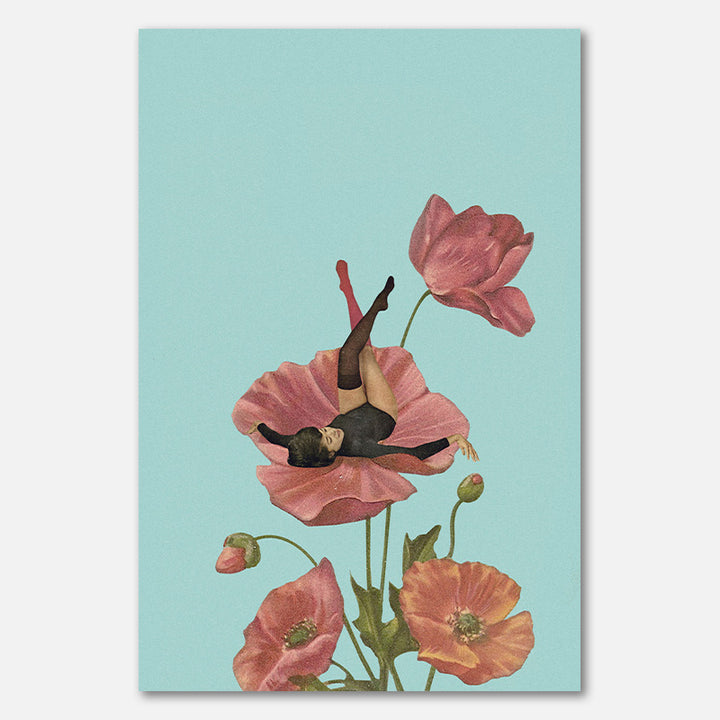 Dit kleurrijke schilderij brengt meteen leven in je interieur met een dromerige vrouw die rustig tussen bloemen ligt. De botanische elementen en grafische vormen maken deze wanddecoratie perfect voor liefhebbers van modern of mid-century design. Ideaal voor wie een frisse, creatieve sfeer zoekt in huis.