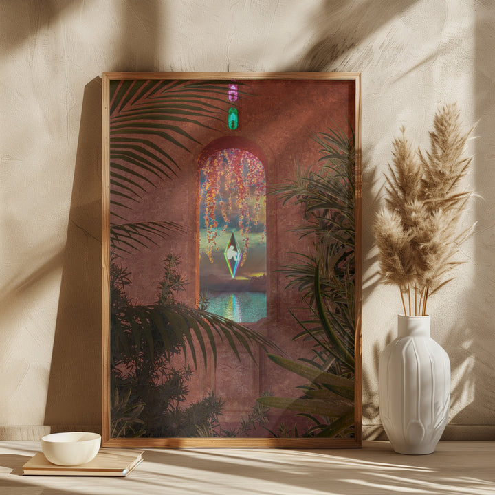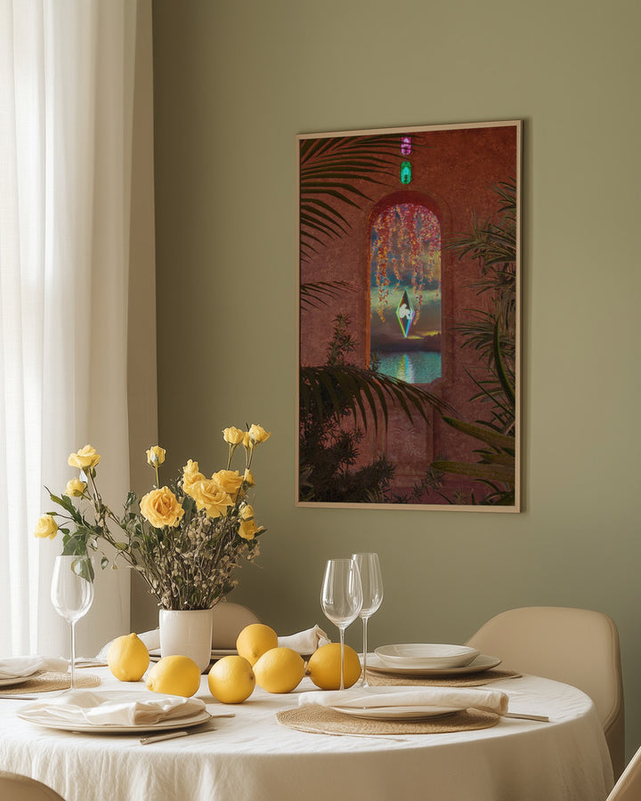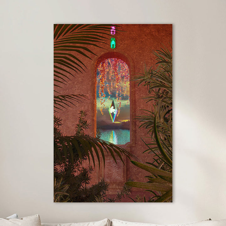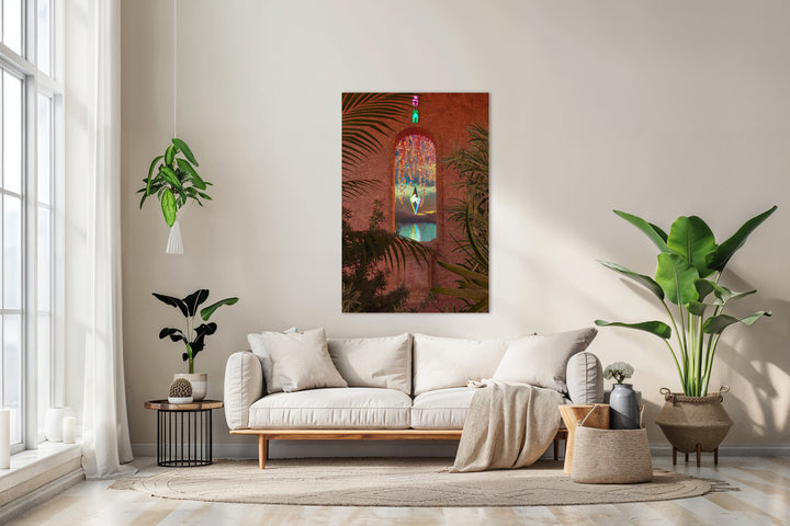Deze fantasievolle wanddecoratie combineert een kleurrijke stad met sprookjesachtige planten en architectuur, waardoor het perfect past bij creatieve, urban en botanische interieurs. Het surrealistische karakter van het schilderij brengt verbeelding en sfeer aan de wand en maakt elke ruimte direct levendiger en unieker.