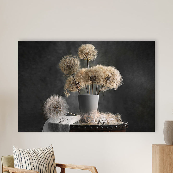 Dit schilderij vangt op subtiele wijze de vergankelijkheid van een uitgebloeide paardenbloem, perfect voor een botanisch interieur of een herfstthema. De zachte kleuren en het stilleven-karakter van deze wanddecoratie brengen rust in elke ruimte en passen moeiteloos in zowel moderne als landelijke stijlen.