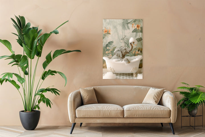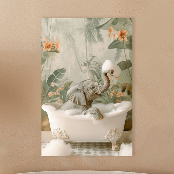 Dit vrolijke schilderij brengt een schattige baby olifant tot leven, omringd door groene en oranje tinten en speelse bubbels. Perfect als wanddecoratie voor de kinderkamer of een frisse look in de badkamer, voegt dit kunstwerk een speelse en rustgevende sfeer toe aan ieder interieur.