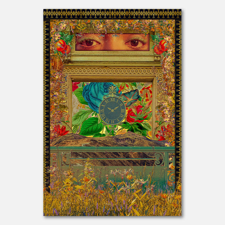 Dit kleurrijke schilderij combineert bloemenvelden, oogverblindende kleuren en surrealistische details als klokken en ogen tot een creatieve collage. Perfect voor een moderne of botanische inrichting voegt deze wanddecoratie een fantasierijke en levendige sfeer toe aan iedere ruimte, passend bij liefhebbers van flora en bijzondere kunst.