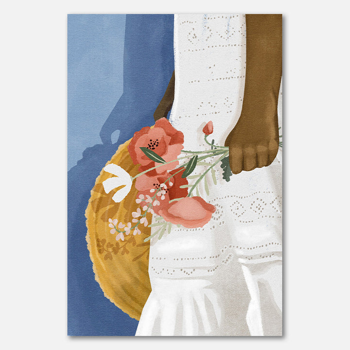 Deze wanddecoratie brengt romantiek en een vleugje elegantie in je interieur, met een vrouw in een blauwe jurk en bloemrijke botanische elementen. Perfect voor liefhebbers van figuratieve en florale kunst die houden van gevoel en sfeer in huis. Ideaal in moderne en bohemien woonstijlen, als eyecatcher aan je muur.