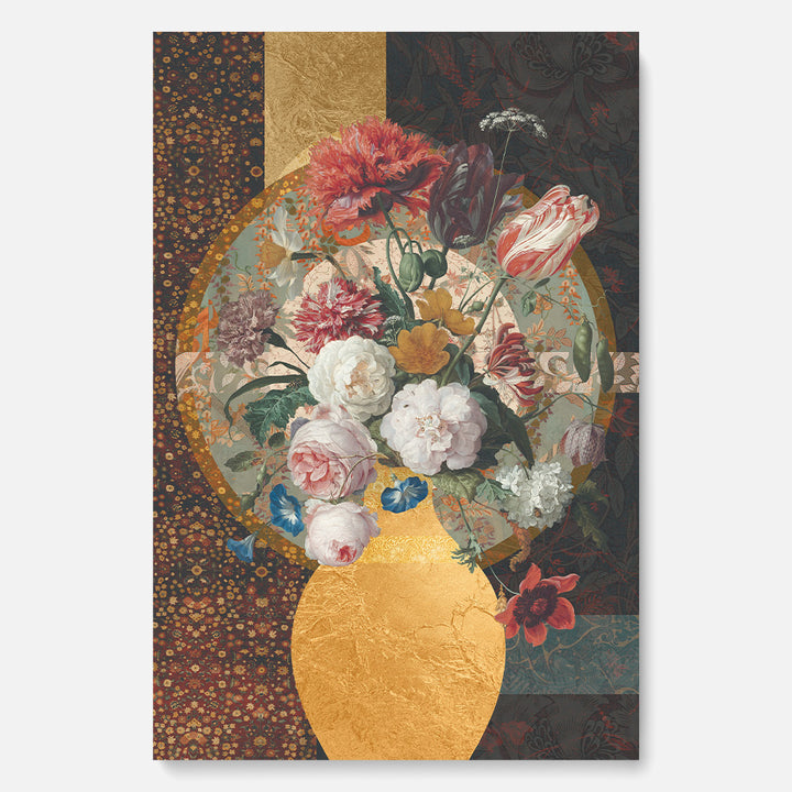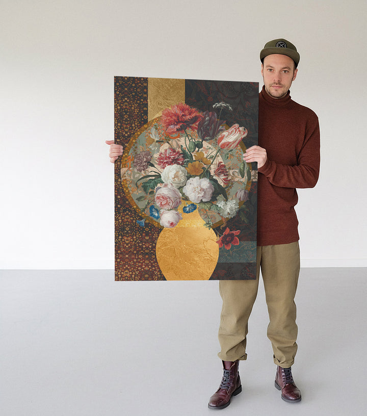 Dit kunstwerk combineert tijdloze bloemen met een gouden glans en vintage patronen. Een moderne ode aan de oude meesters, vol kleur, detail en elegantie. Past prachtig in een warm of klassiek interieur.