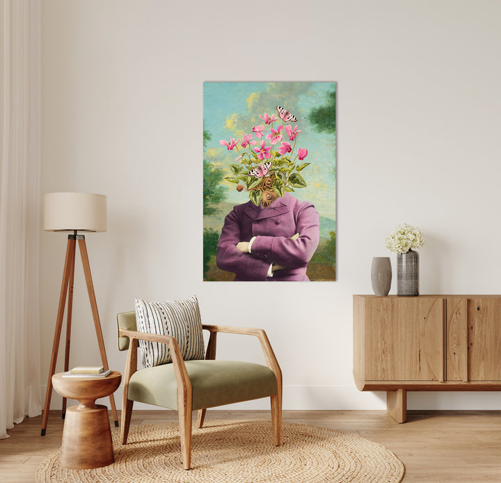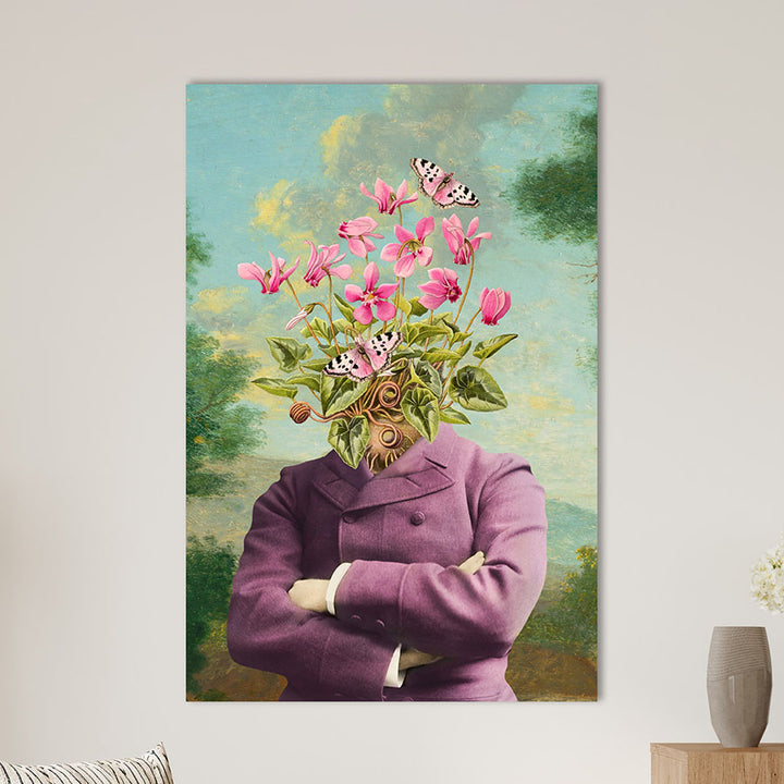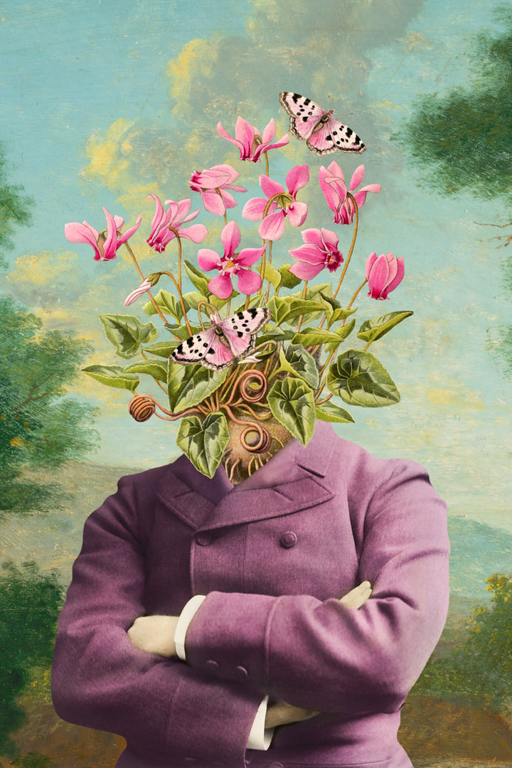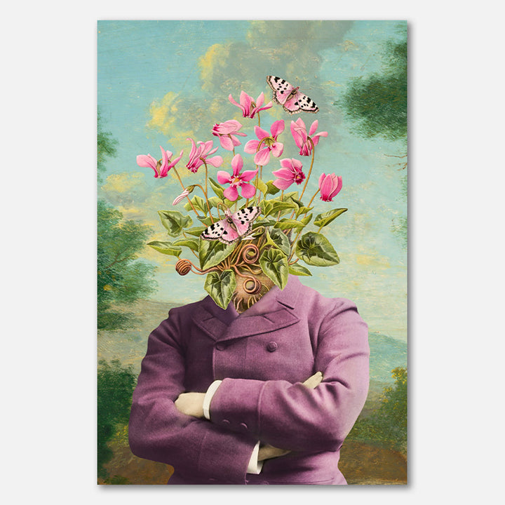 Ik zie een landschap, een keurig in paars geklede man, bloemen en vlinders.
