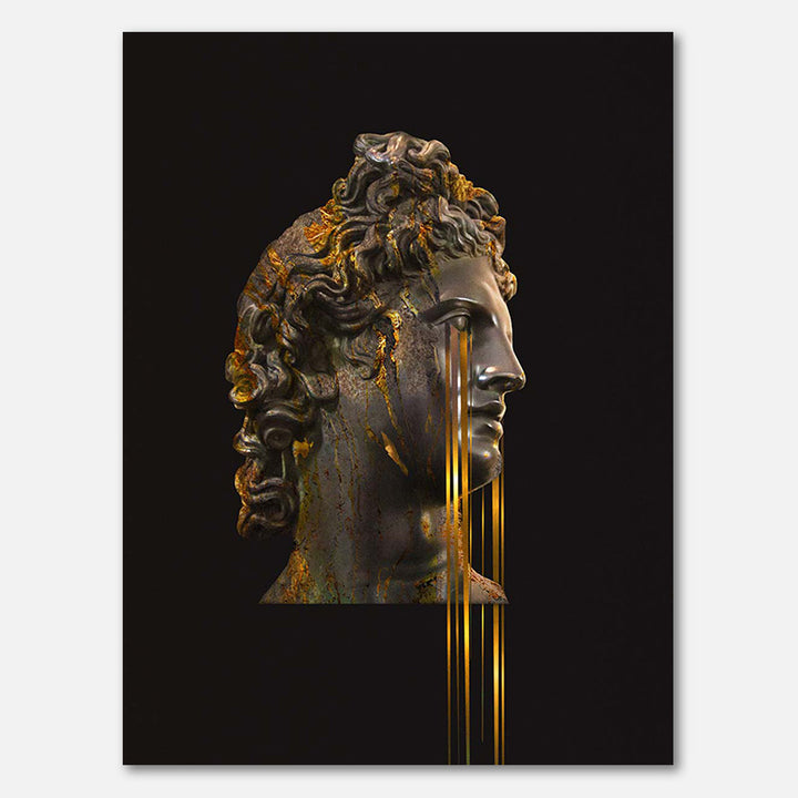 Deze wanddecoratie valt op door zijn elegante collage stijl, waarin een buste met gouden accenten en droevige ogen centraal staat. Perfect voor liefhebbers van minimal art en digital art die een vleugje luxe en gratie zoeken in hun interieur. Het past prachtig bij moderne, minimalistische en stijlvolle ruimtes.
