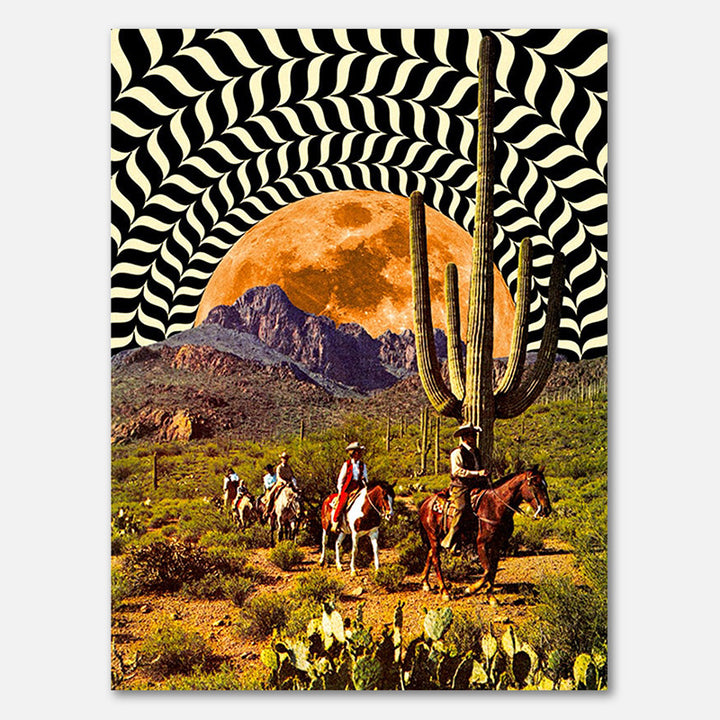 Welkom in het Wilde Westen... maar dan in een alternatieve realiteit! Dit psychedelische kunstwerk mixt klassieke cowboy-taferelen met een hypnotiserende, surrealistische twist. De rijzende maan, de iconische cactussen en het optische patroon zorgen voor een visuele trip die tijd en ruimte overstijgt. Een gedurfde en unieke print voor liefhebbers van westerns, kunst en alles wat nét even anders is.