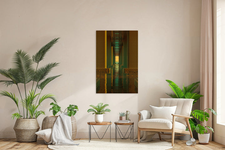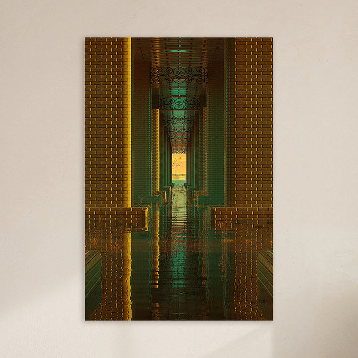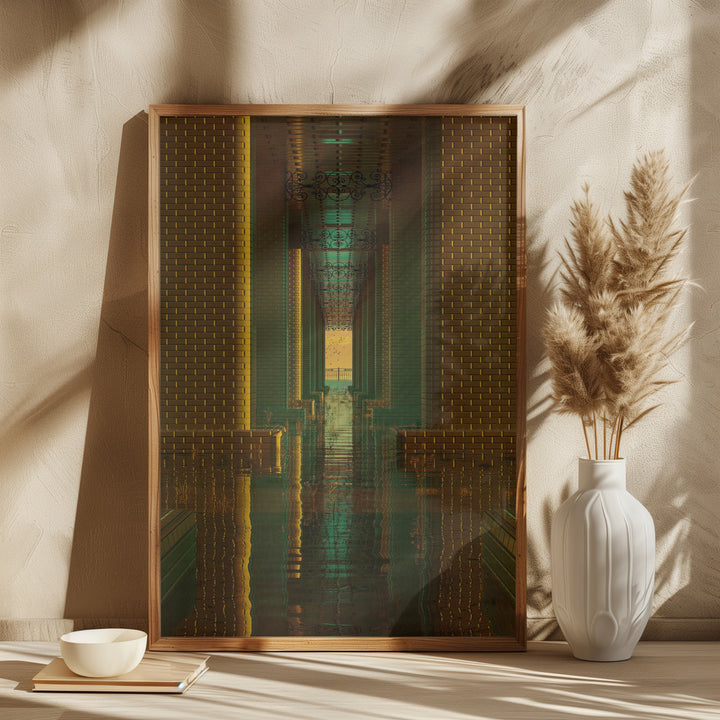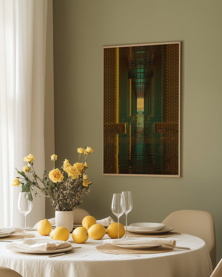 Deze kleurrijke wanddecoratie brengt een creatieve mix van abstracte vormen, architectuur en het zachte spel van water en reflecties je interieur in. Met levendige tinten groen en geel, indrukwekkende pilaren en een zwembadachtige sfeer past dit schilderij perfect bij moderne, creatieve en minimalistische woonstijlen. Het zorgt direct voor een unieke, artistieke uitstraling in jouw ruimte.
