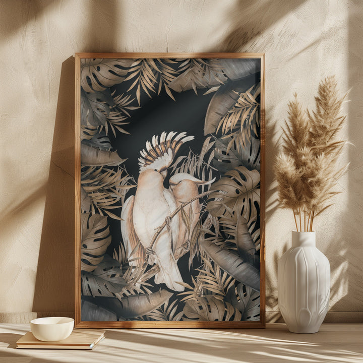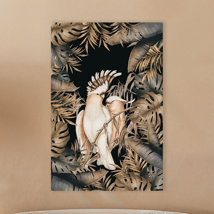 Laat je interieur tot leven komen met deze exotische wanddecoratie, waar witgekroonde kaketoes zich nestelen tussen weelderig tropisch groen tegen een donkere achtergrond. Dit kunstwerk past perfect in een modern, botanisch of boho interieur en brengt een levendig junglegevoel in elke ruimte.