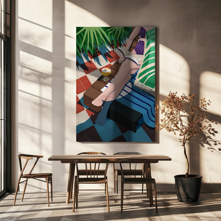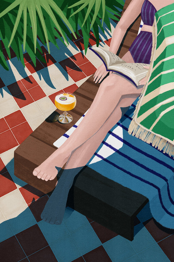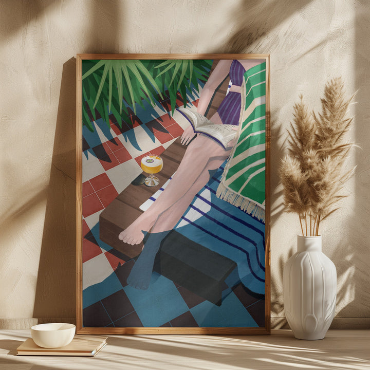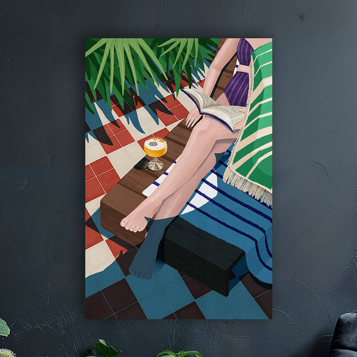 Deze wanddecoratie brengt het ultieme zomergevoel in huis: een vrouw ontspant met een goed boek en een cocktail aan het zwembad, omringd door strand, zon en relaxte vibes. Perfect voor een coastal of moderne interieurstijl, deze print ademt vakantie, rust en genieten van het moment uit.