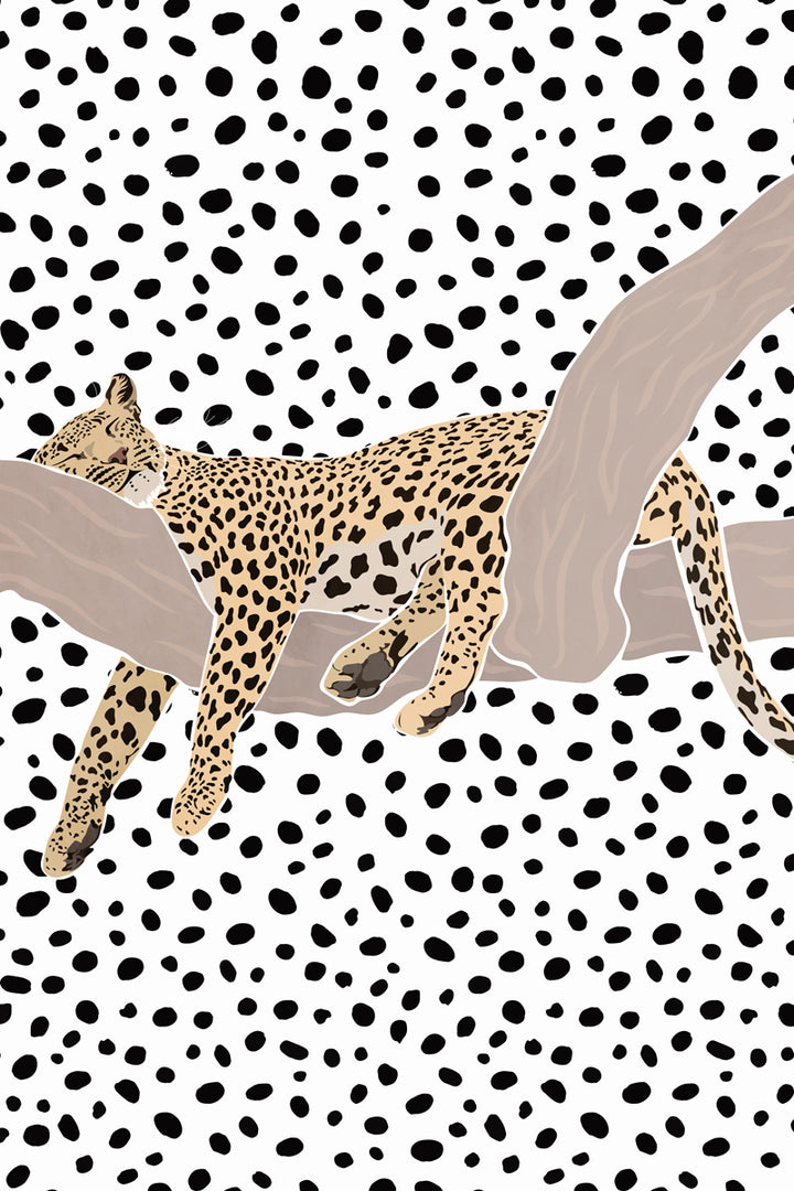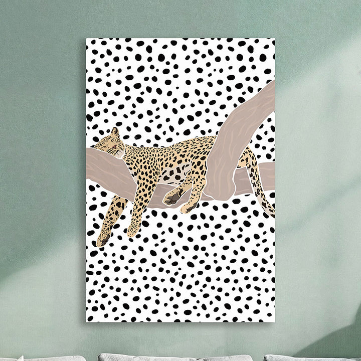 Dit schilderij brengt een ontspannen sfeer met een slapende luipaard tussen speelse polkadots, perfect als opvallende wanddecoratie in je woonkamer of slaapkamer. Het levendige ontwerp past prachtig bij moderne, boho en eclectische interieurs en zorgt direct voor een warme, gezellige touch aan je muur.