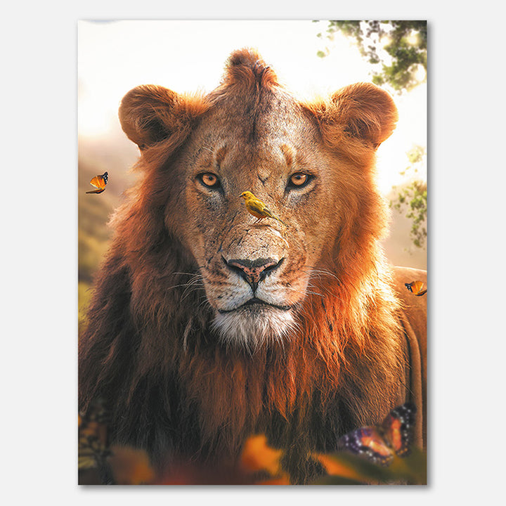 Een ontwerp van een leeuw omgeven door vogels en vlinders.