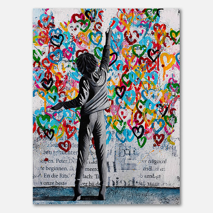 Een meisje maakt een graffiti schilderij met kleurrijke harten op een grijze, grauwe betonnen muur. Ze wil de sombere stad waarin ze woont opfleuren en laten zien dat er meer liefde nodig is in de wereld.