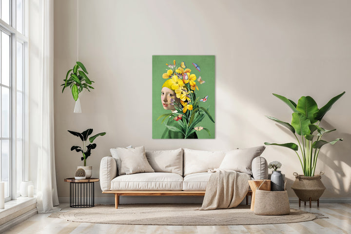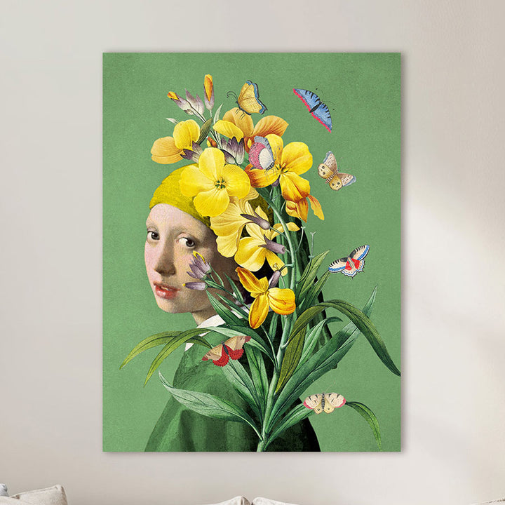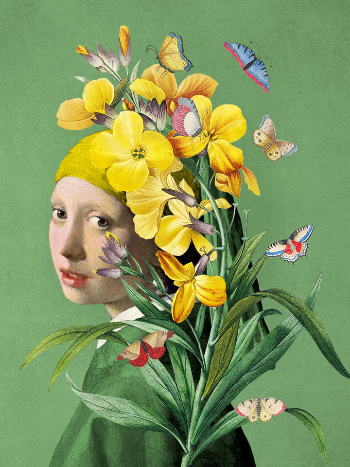 Collage met vintage, botanische afbeeldingen van een prachtige gele plant, van vlinders en van het door de Nederlandse kunstschilder Johannes Vermeer in 1665-1667 geschilderde "Meisje met de parel".