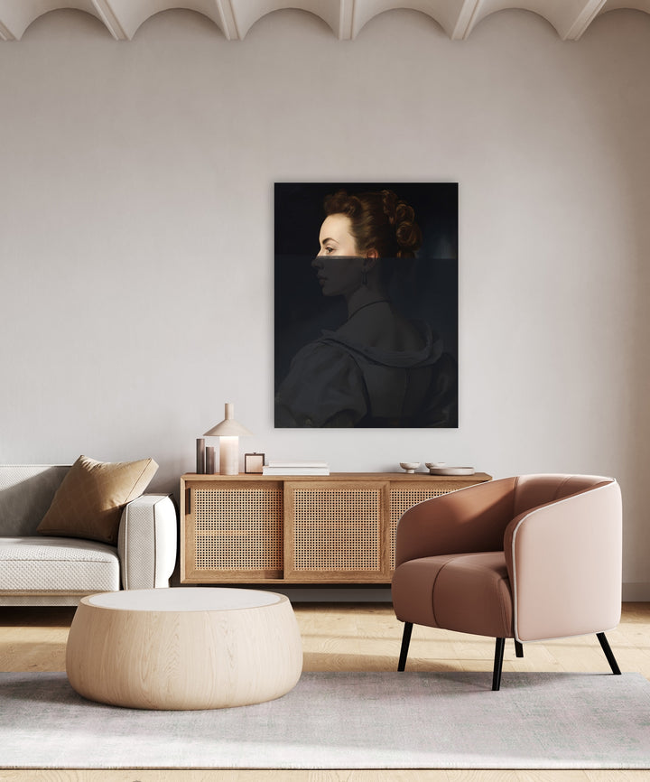 Deze moderne wanddecoratie vangt de krachtige uitstraling van een vrouw en geeft direct een stijlvolle touch aan je interieur. Door het tijdloze portret past dit schilderij perfect in een minimalistisch, urban of Scandinavisch interieur en zorgt het voor een subtiel artistiek accent aan iedere wand.