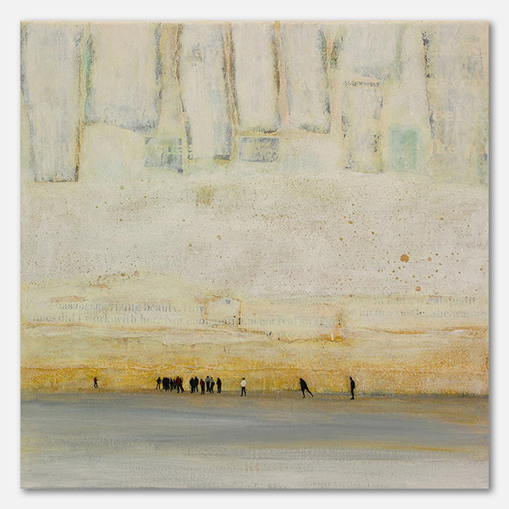 Een surreëel , typisch nederlands, winterlandschap, met mensen die schaatsen op natuurlijk ijs. Mixed media en assemblage op papier. Mijn collages zijn opgebouwd met allerlei foto's, plaatjes en afbeeldingen die ik in de loop der jaren heb verzameld. Als eerste schilder ik een ondergrond met aquarel of acrylverf . Daarop wordt de collage in lagen aangebracht en soms weer losgetrokken om een oud en verweerd effect te creëren. Door de lagen over elkaar heen aan te brengen ontstaat een transparant effect, zoals alleen met aquarelverf mogelijk is. De eerste lagen zijn zichtbaar door de collage lagen heen. De meeste collages zijn bewerkt met acrylverf, in de vorm van stempelwerk of gewoon overgeschilderd. Daarnaast gebruik ik vaak een balpen of potlood om op de collages te tekenen.