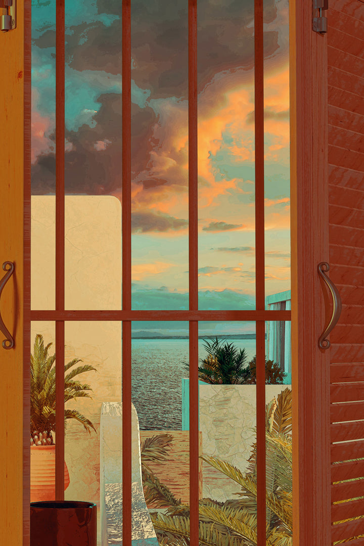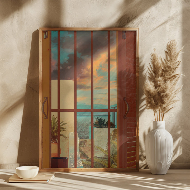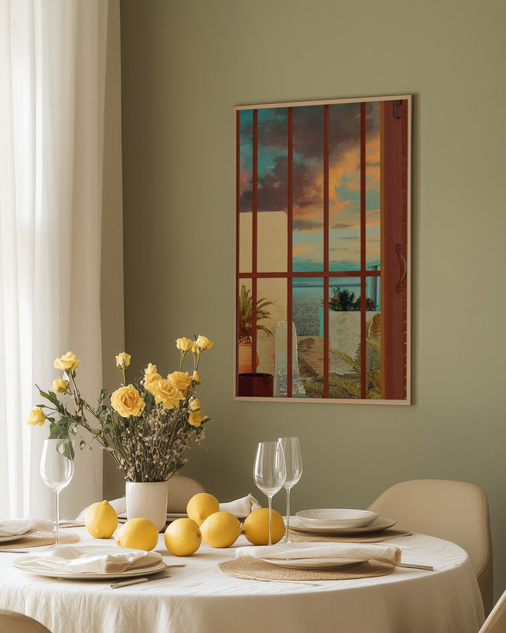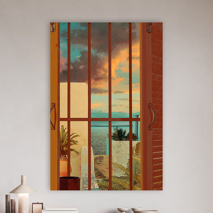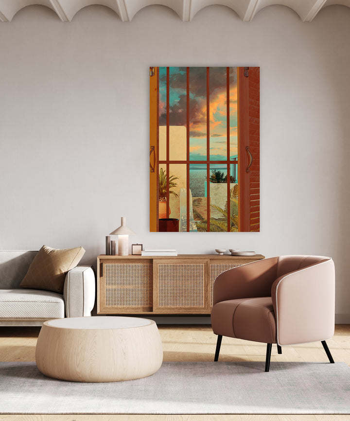 Deze wanddecoratie geeft je interieur een dromerige twist met een surrealistische kijk op een open raam, dat uitkijkt op een warme zonsondergang boven de oceaan. Het schilderij brengt levendige kleuren en een gevoel van ruimte in huis, perfect passend bij botanische en creatieve woonstijlen.