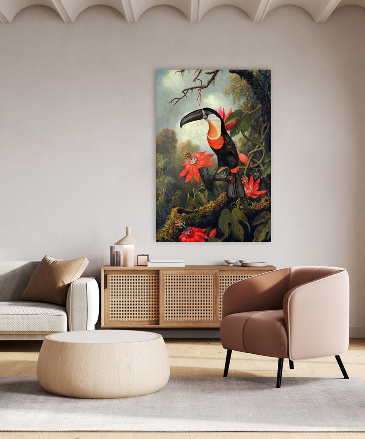 Het landschap op de achtergrond is afkomstig uit het schilderij "Hummingbird and Passionflowers", vervaardigd door de Amerikaanse kunstschilder Martin Johnson Heade (1819–1904). De kolibrie heb ik zoals je ziet, vervangen door een toekan.
