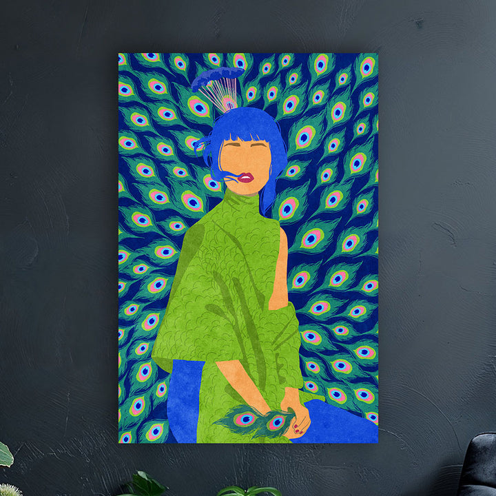 Deze wanddecoratie straalt kracht en elegantie uit door de combinatie van een vrouwelijk portret met levendige pauwenveren, perfect voor liefhebbers van kleurrijke kunst. Het schilderij past prachtig binnen moderne en eclectische interieurs, waar het een unieke en opvallende sfeer aan elke ruimte geeft.