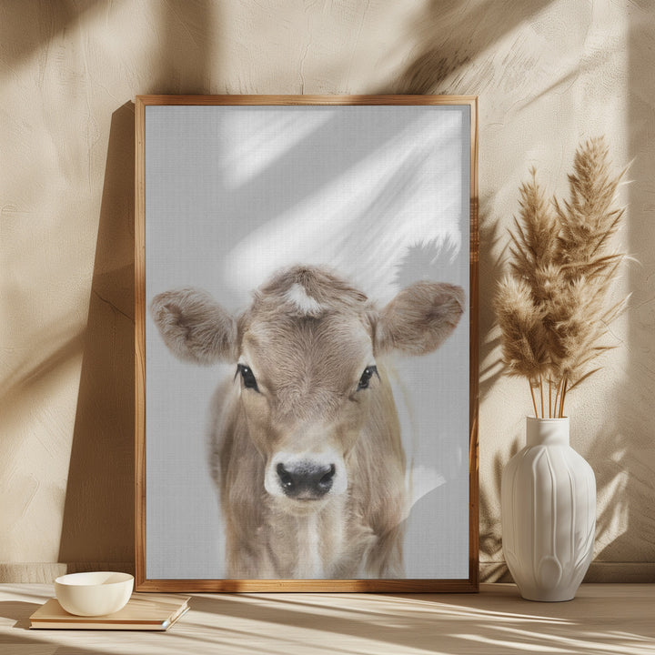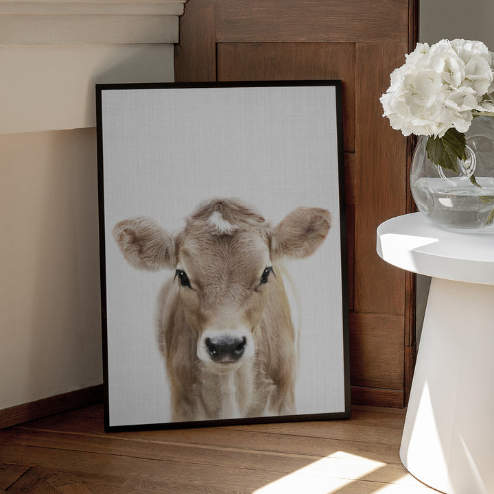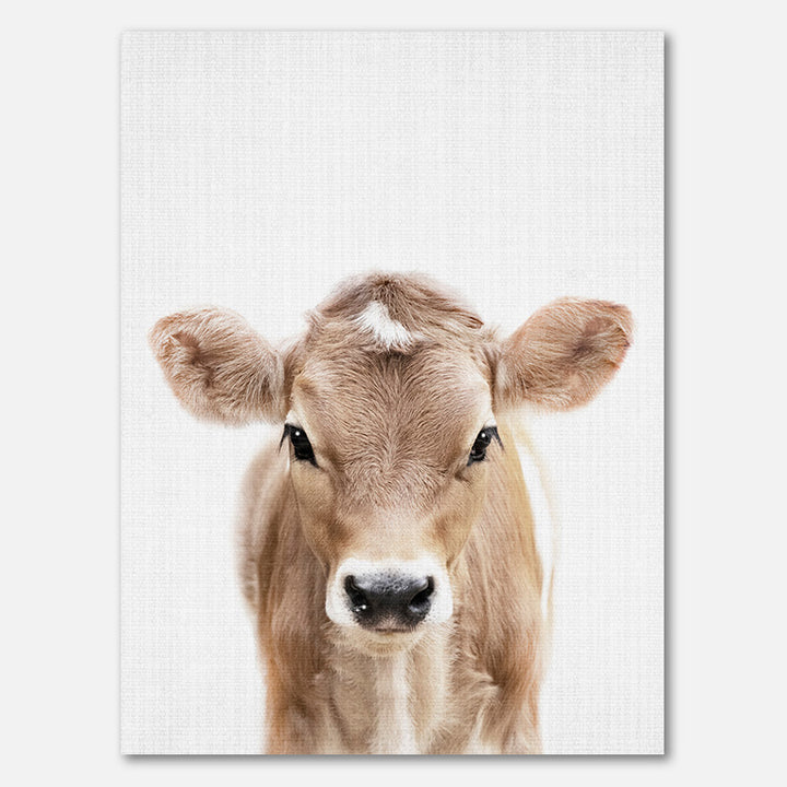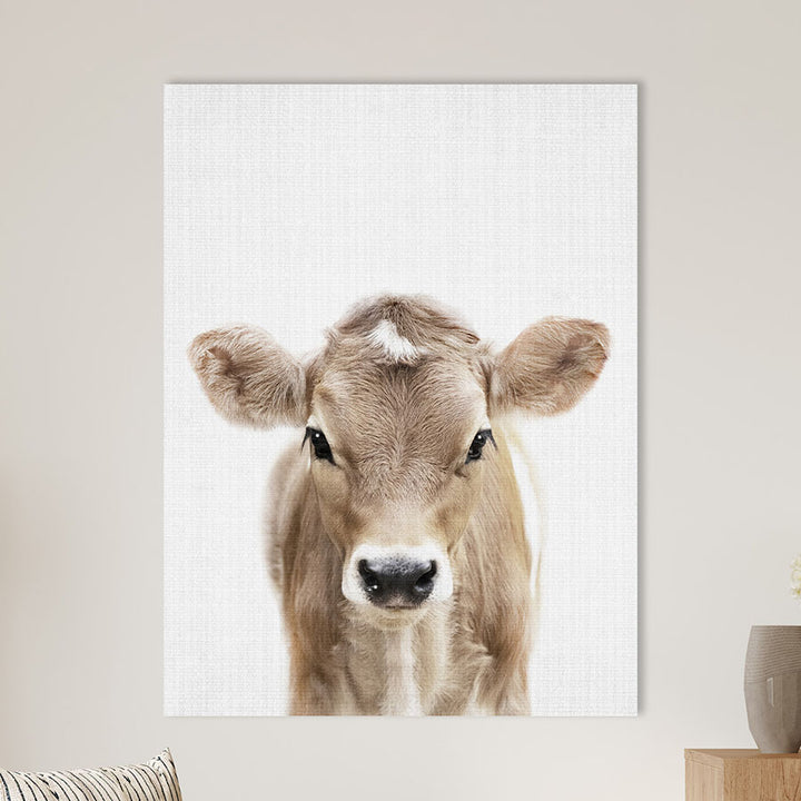 Dit schilderij brengt een glimlach met zijn schattige baby koe die nieuwsgierig om het hoekje gluurt. Deze wanddecoratie past perfect bij een landelijke, boerderij- of kinderkamerstijl en voegt een speelse, gezellige sfeer toe aan elke ruimte. Perfect voor liefhebbers van dieren en rustieke interieurs.