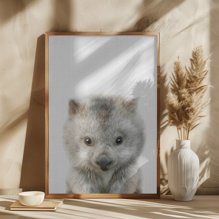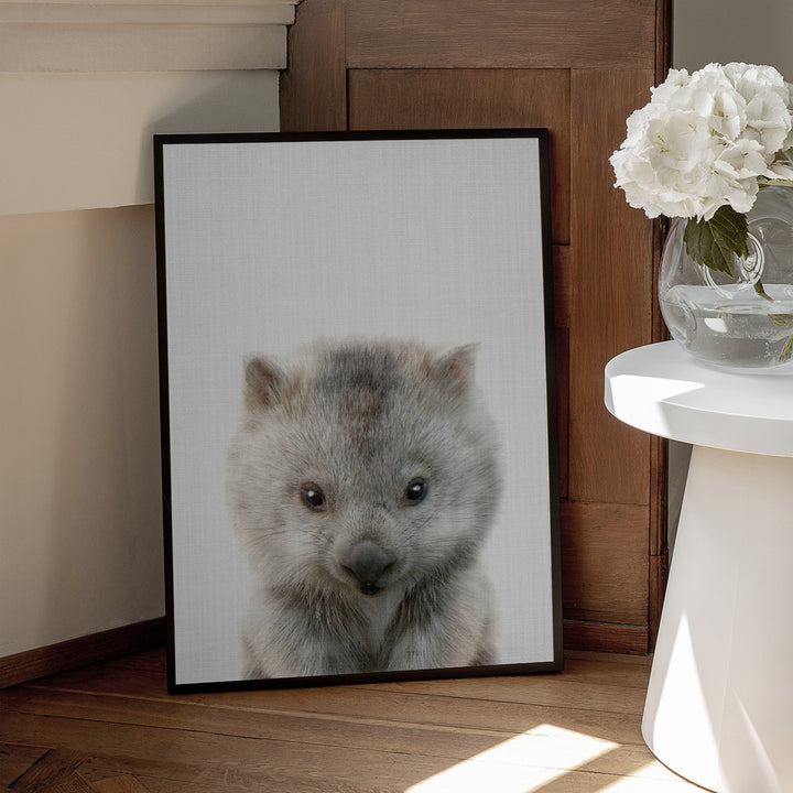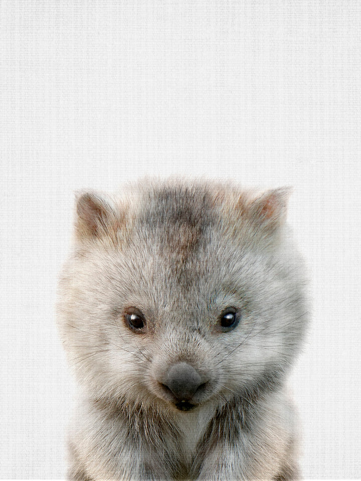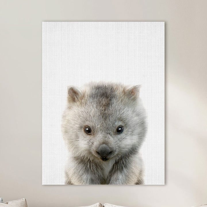 Breng een vleugje schattigheid in huis met deze wanddecoratie van een nieuwsgierige baby wombat die je direct doet glimlachen. Dit schilderij geeft elk interieur, van kinder- tot woonkamers, een speelse en natuurlijke sfeer. Perfect voor liefhebbers van wilde dieren en een frisse, moderne woonstijl.