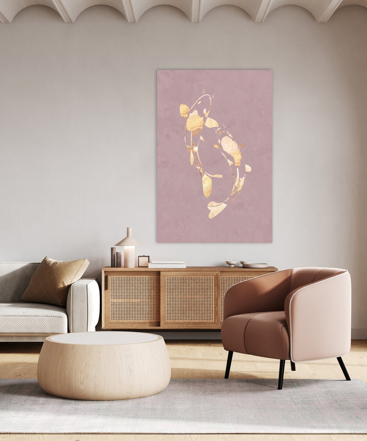 Deze prachtige wanddecoratie brengt kleur en elegantie aan je muur met een sierlijke illustratie van zwemmende koi vissen in roze en goud. Het abstracte karakter en de Japanse invloeden passen perfect in moderne, minimalistische en eclectische interieurs. Ideaal om een stijlvolle sfeer te creëren in je woonkamer of studio.