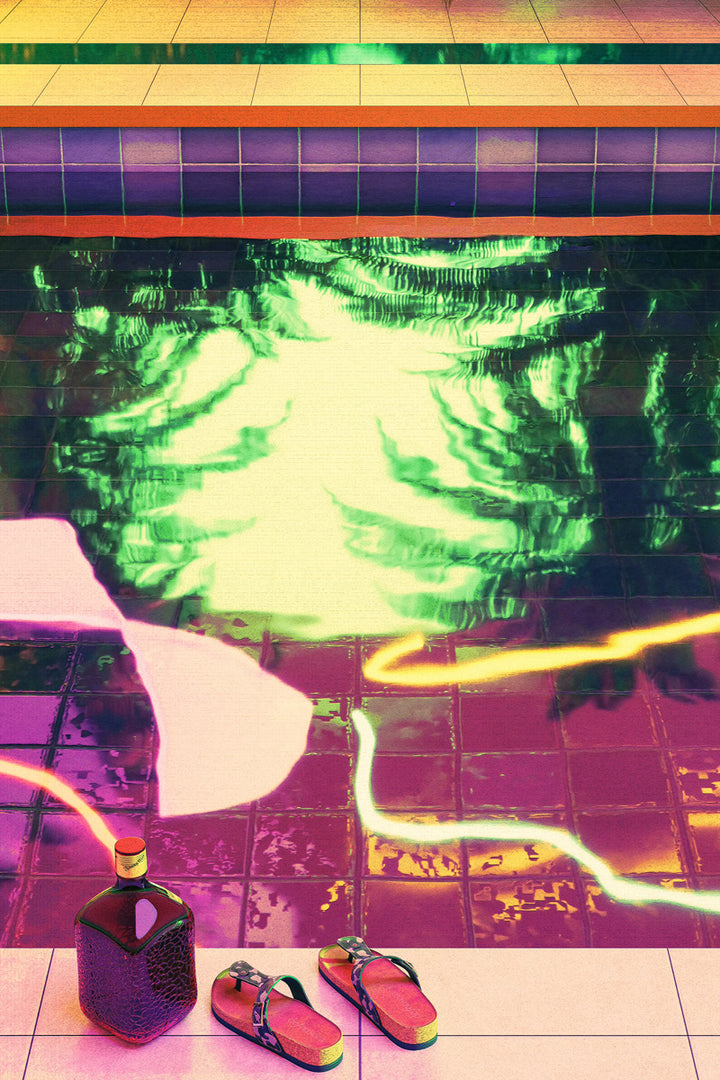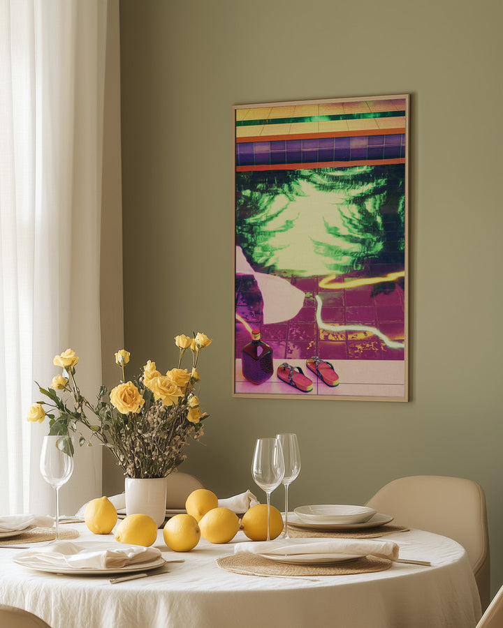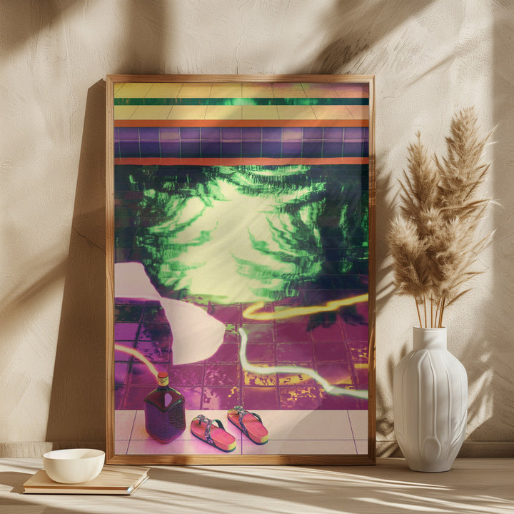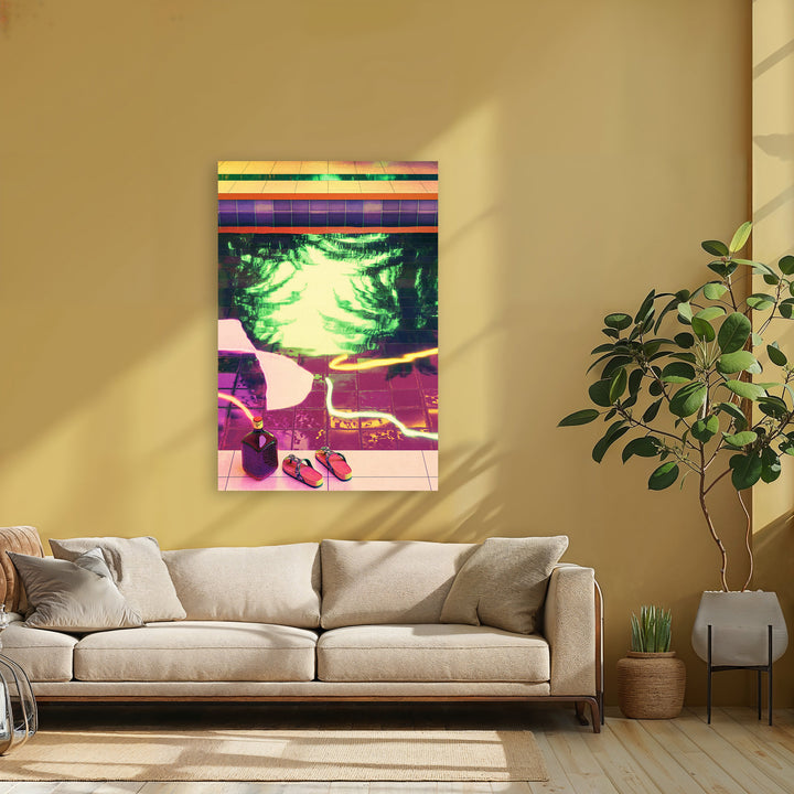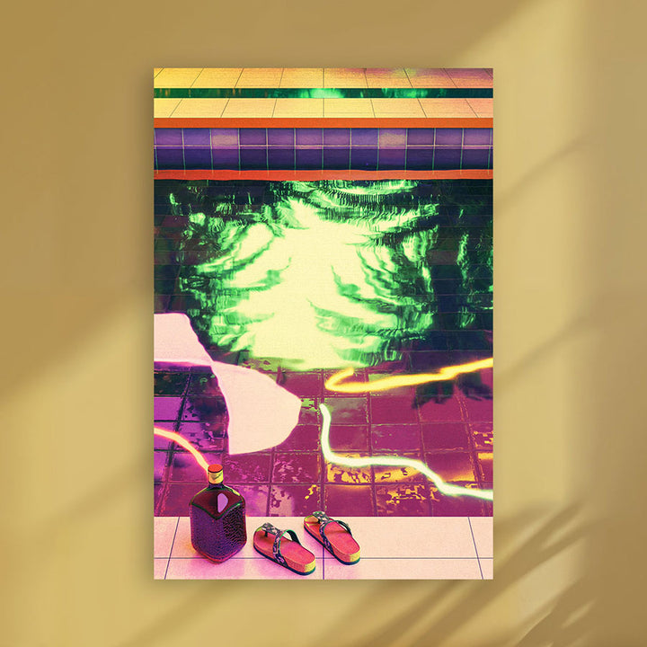 Dit schilderij brengt een surrealistisch zwembadlandschap tot leven met neonkleuren en een retro-futuristische sfeer. Perfect voor liefhebbers van unieke wanddecoratie die houden van vaporwave en synthwave interieurs. Deze wanddecoratie past helemaal in moderne en creatieve woonstijlen en zorgt direct voor een bijzondere vibe in je ruimte.