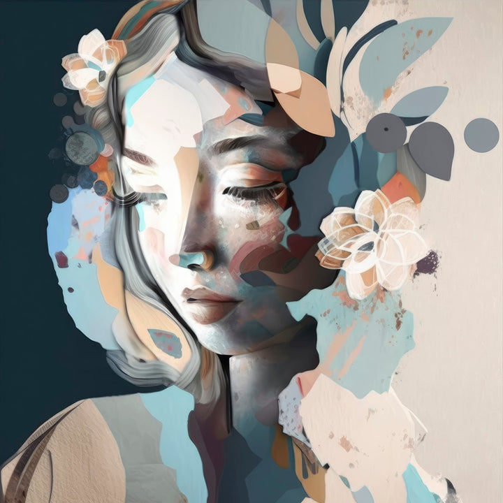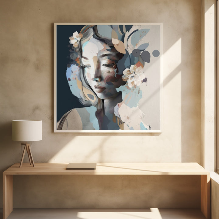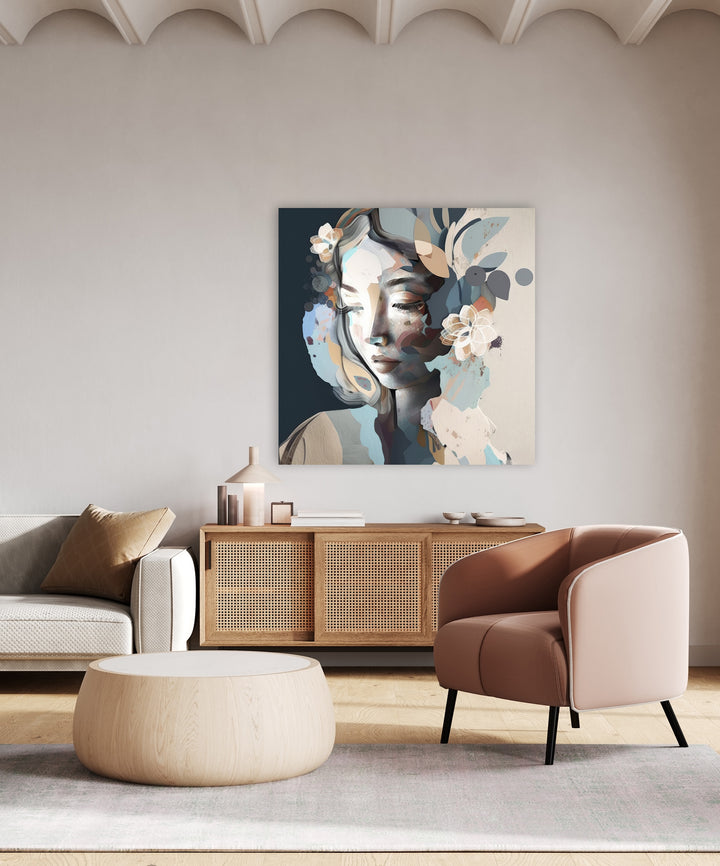 Deze wanddecoratie combineert vrouwelijke portretten met abstracte vormen, warme beige en blauwe tinten en botanische details. Perfect voor een hedendaags interieur met multiculturele invloeden en een vleugje natuur. Het schilderij voegt karakter toe aan elke ruimte en laat je woonkamer of slaapkamer echt tot leven komen.