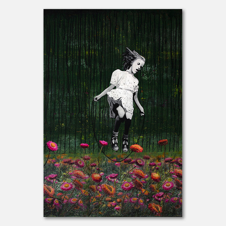 Een meisje speelt met haar springtouw in het bloemenveld, met haar rug naar het donkere bos. Alsof ze iets probeert te negeren dat in de toekomst gaat gebeuren
