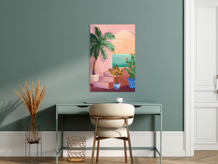 Deze wanddecoratie brengt een tropische en exotische sfeer in je interieur, met felgekleurde bloemen, palmbomen en een vleugje zee voor een zomerse vibe. Ideaal voor botanische of moderne woonstijlen, past dit schilderij prachtig in de woonkamer, keuken of een lichte hal waar natuur en paradijs centraal staan.