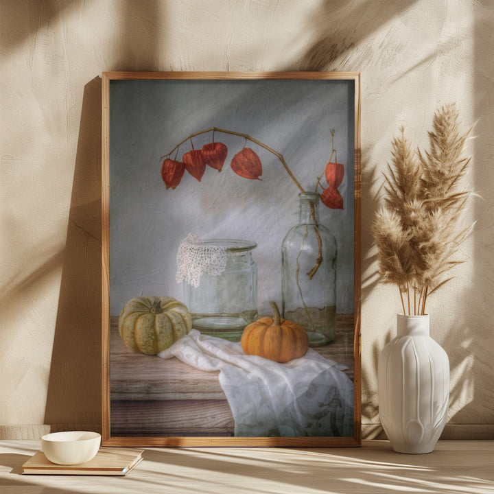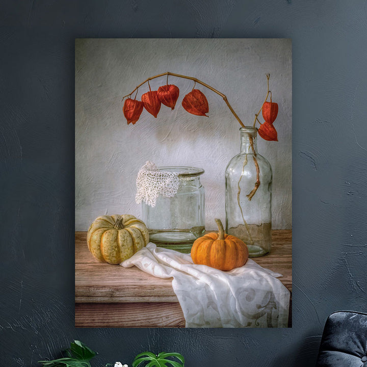 Deze sfeervolle wanddecoratie brengt landelijke charme en een rustiek gevoel in huis, met warme tinten van oranje pompoenen en delicate physalis. Perfect voor een klassiek of bohemian interieur, laat dit schilderij je genieten van een serene, botanische sfeer en een vleugje nostalgie aan je muur.