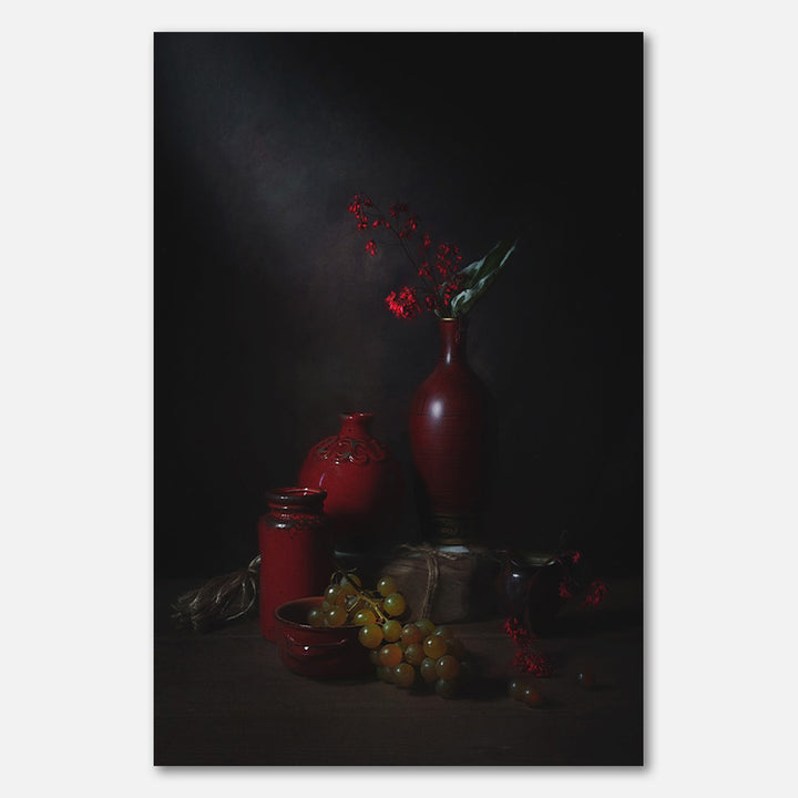 Deze wanddecoratie brengt de verfijnde sfeer van een rijke stilleven tot leven, met sappige rode druiven en elegante vazen centraal in beeld. Het tijdloze karakter van dit schilderij sluit moeiteloos aan bij zowel moderne als klassieke interieurs. Voeg direct een kunstzinnige smaakmaker toe aan je ruimte met deze kunstzinnige wanddecoratie.
