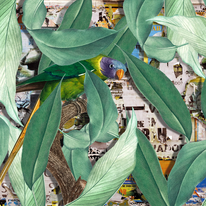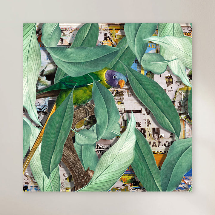 Het portret van een tropische vogel, verborgen achter plantenbladeren.