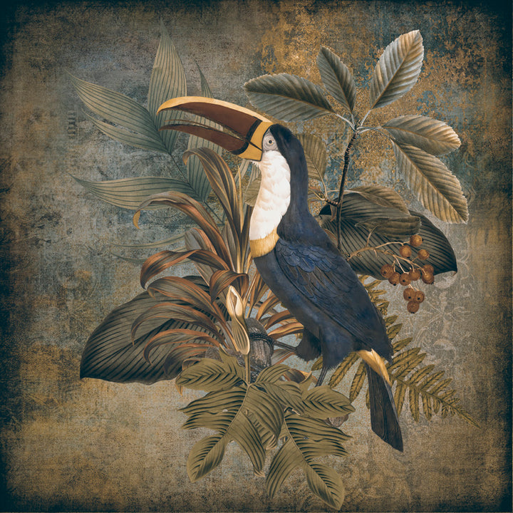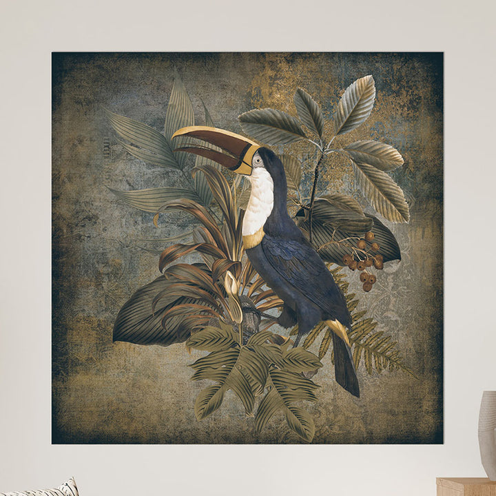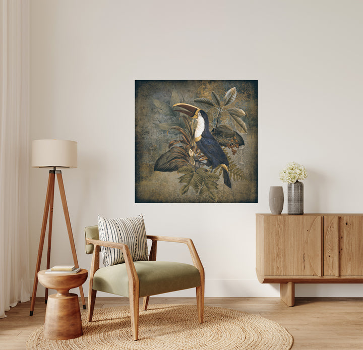 Deze kleurrijke wanddecoratie brengt een tropische sfeer in huis met een levendige illustratie van een toekan tussen botanische bladeren en bloemen. Het artwork straalt vintage charme uit en past perfect bij een retro, jungle of bohemian interieurstijl, waar natuur en exotische dieren de hoofdrol spelen.