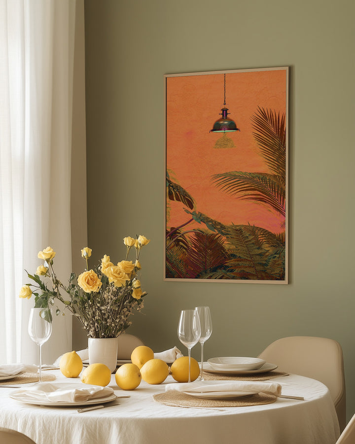 Deze levendige wanddecoratie brengt een zomerse, tropische sfeer in huis, perfect voor een boho of modern interieur. Met kleurrijke bladeren en palmen ademt het schilderij de energie van een beach house aan de kust en een botanische setting. Ideaal als opvallend accent voor je woonkamer of slaapkamer.