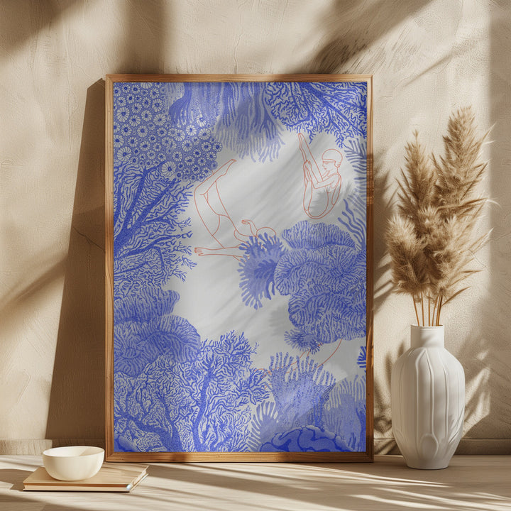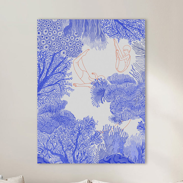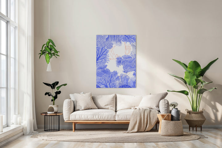 Deze wanddecoratie brengt een elegante vrouwelijke zwemmer tot leven in een minimalistische stijl, perfect voor liefhebbers van eenvoud en gratie. Met subtiele blauwe tinten en koraalaccenten voegt dit schilderij een rustgevende, moderne vibe toe aan je interieur. Ideaal voor Scandinavische, minimalistische of eigentijdse woonruimtes.