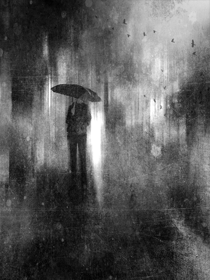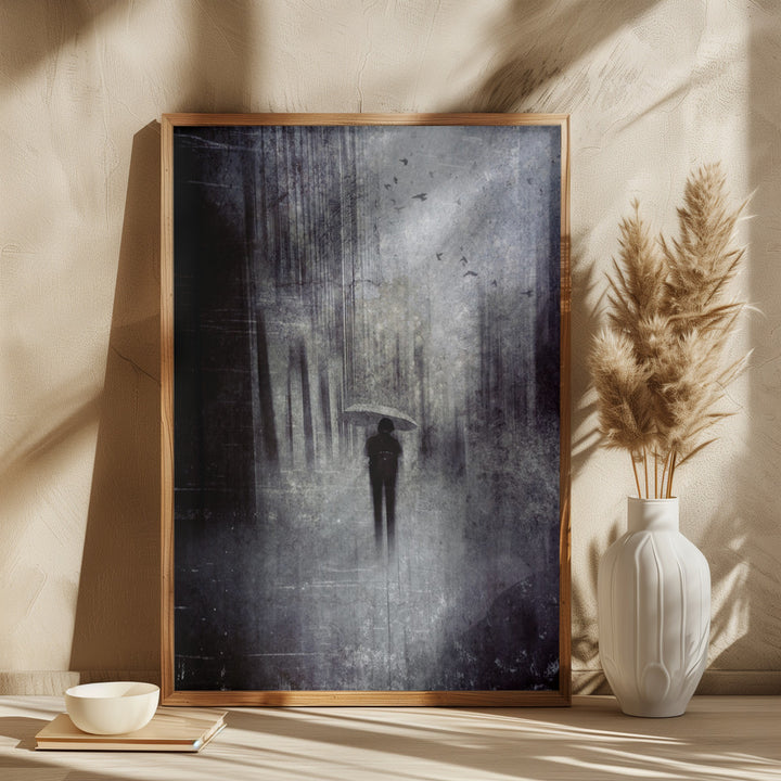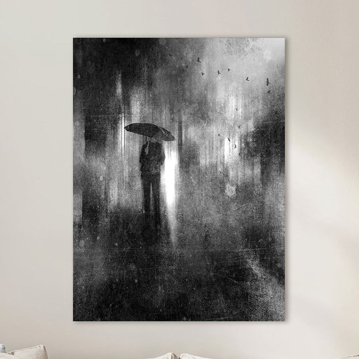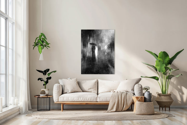 Deze wanddecoratie toont het intieme moment van alleen wandelen in de regen, perfect voor liefhebbers van rustige en dromerige sferen. Met zijn ingetogen kleuren en moderne vibe past dit schilderij prachtig in minimalistische, Scandinavische of industriële interieurs, waar je een vleugje contemplatie wilt toevoegen aan jouw ruimte.