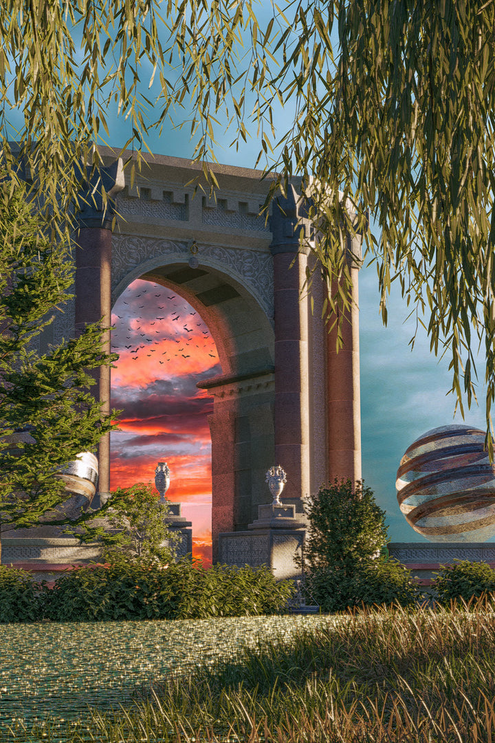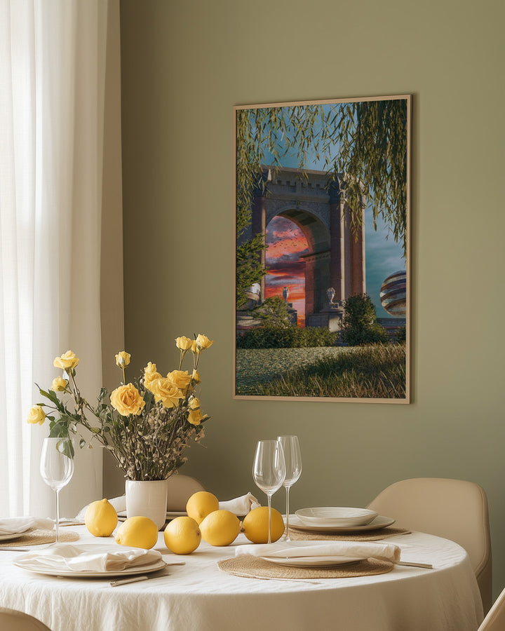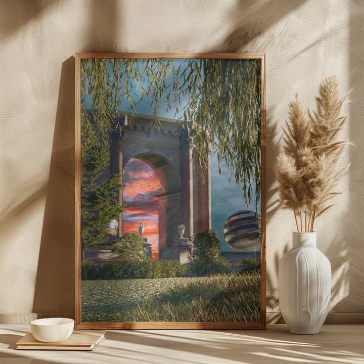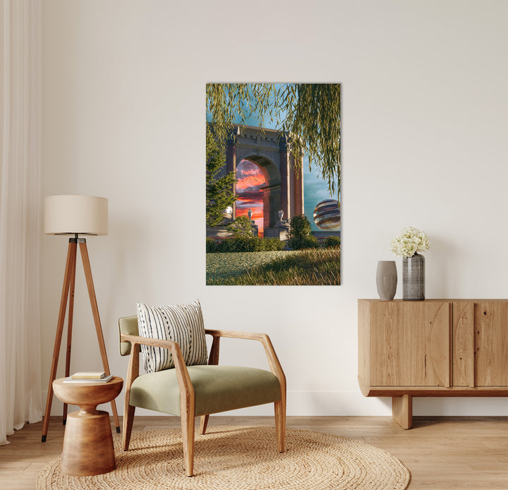 Dit schilderij neemt je mee naar een betoverend landschap vol felle kleuren en magische bogen, waar een groep vogels zweeft tussen de oude stenen en de wilgen zachtjes bewegen. Perfect voor liefhebbers van mysterieuze, surrealistische wanddecoratie; het past prachtig binnen een bohemian of modern interieur en voegt direct karakter toe aan elke ruimte.