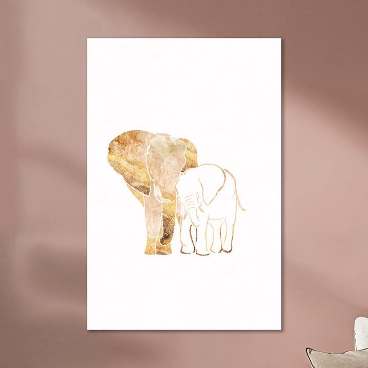 Deze wanddecoratie straalt luxe en eenvoud uit, met elegante silhouetten van olifanten in wit en goud. Perfect voor een modern of Scandinavisch interieur dat warme accenten en een serene sfeer zoekt. Dit schilderij geeft jouw kamer een speelse, heldere uitstraling en past prachtig bij babykamers of een stijlvolle woonkamer.