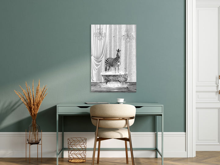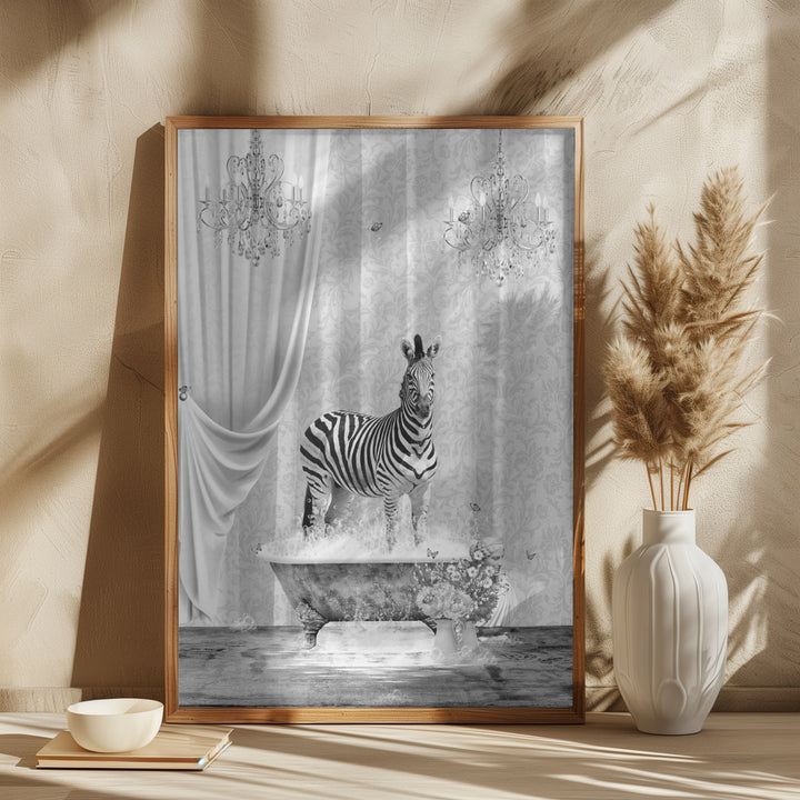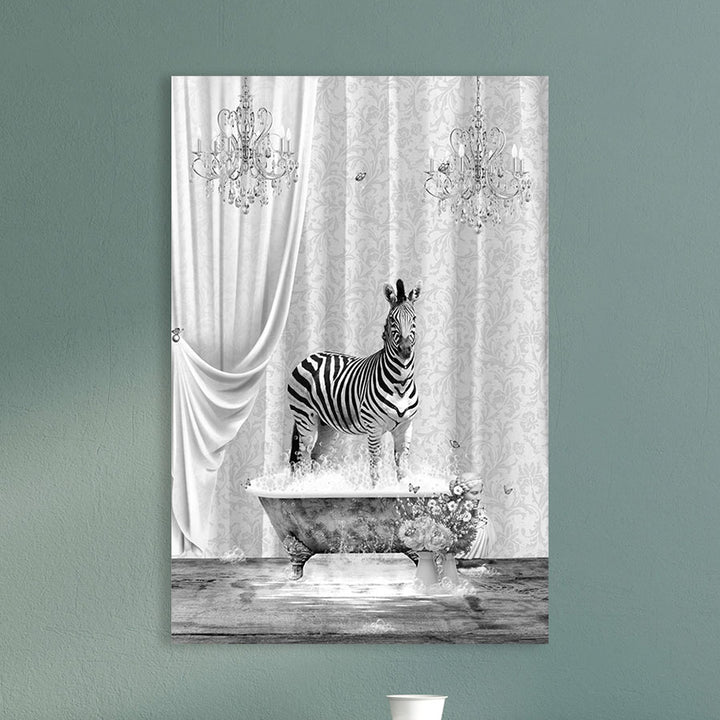 Dit schilderij brengt een stijlvolle zebra in een surrealistisch zwart-wit bubbelbad tot leven en voegt direct een speelse, moderne twist toe aan je interieur. Perfect voor liefhebbers van opvallende wanddecoratie in de badkamer of retro- en vintage geïnspireerde ruimtes!