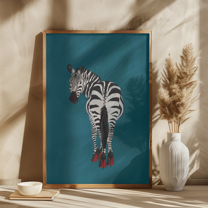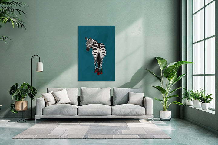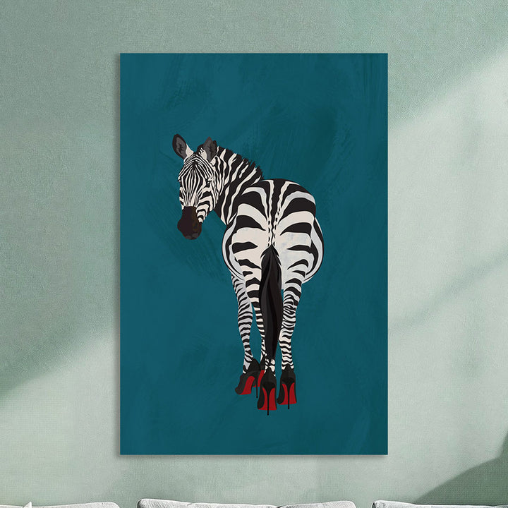 Dit schilderij brengt een glimlach op je gezicht met een zebra op opvallende hakken in een frisse groene achtergrond. De grappige combinatie van dieren en fashion, perfect voor de babykamer of een stijlvolle kinderkamer, zorgt direct voor een speelse en luxe uitstraling aan je wanddecoratie.